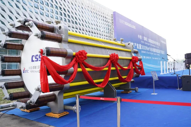 该装备围绕我国氢能高质量发展重大需求,突破了大功率、高电密、宽负载、低电耗等多项前沿技术,实现了单体产氢量由2000Nm3/h到3000Nm3/h的跨越,运行电流密度提升17%,槽体重量降低13%,制氢系统具备30%-110%的动态调节能力,能耗达到国标一级能效标准,可显著提高单机产能、降低生产投入和运行成本,为大规模绿氢制取提供了创新型解决方案。
