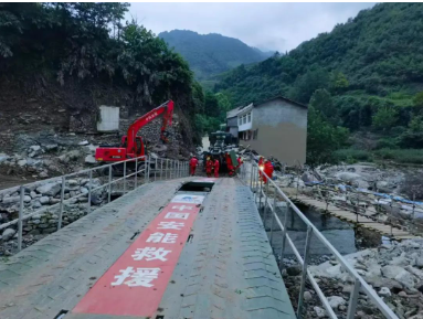 四川省公路交通应急装备物资储备中心在现场道路损毁处架设了一座21米应急机械化桥,有效保障救援人员和重型设备通行。架设前,中船应急和四川省公路交通应急装备物资储备中心进行了工作对接并提供技术支持。