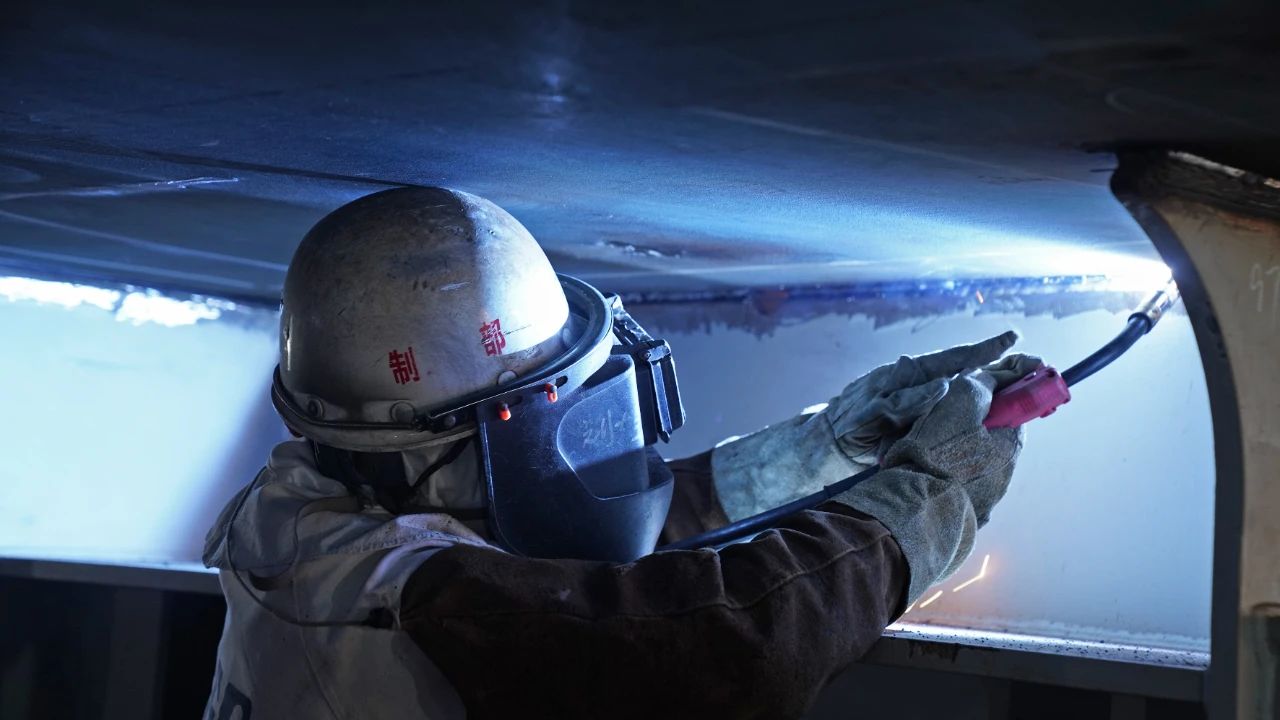 广船国际——焊工正在开展分段焊接施工。