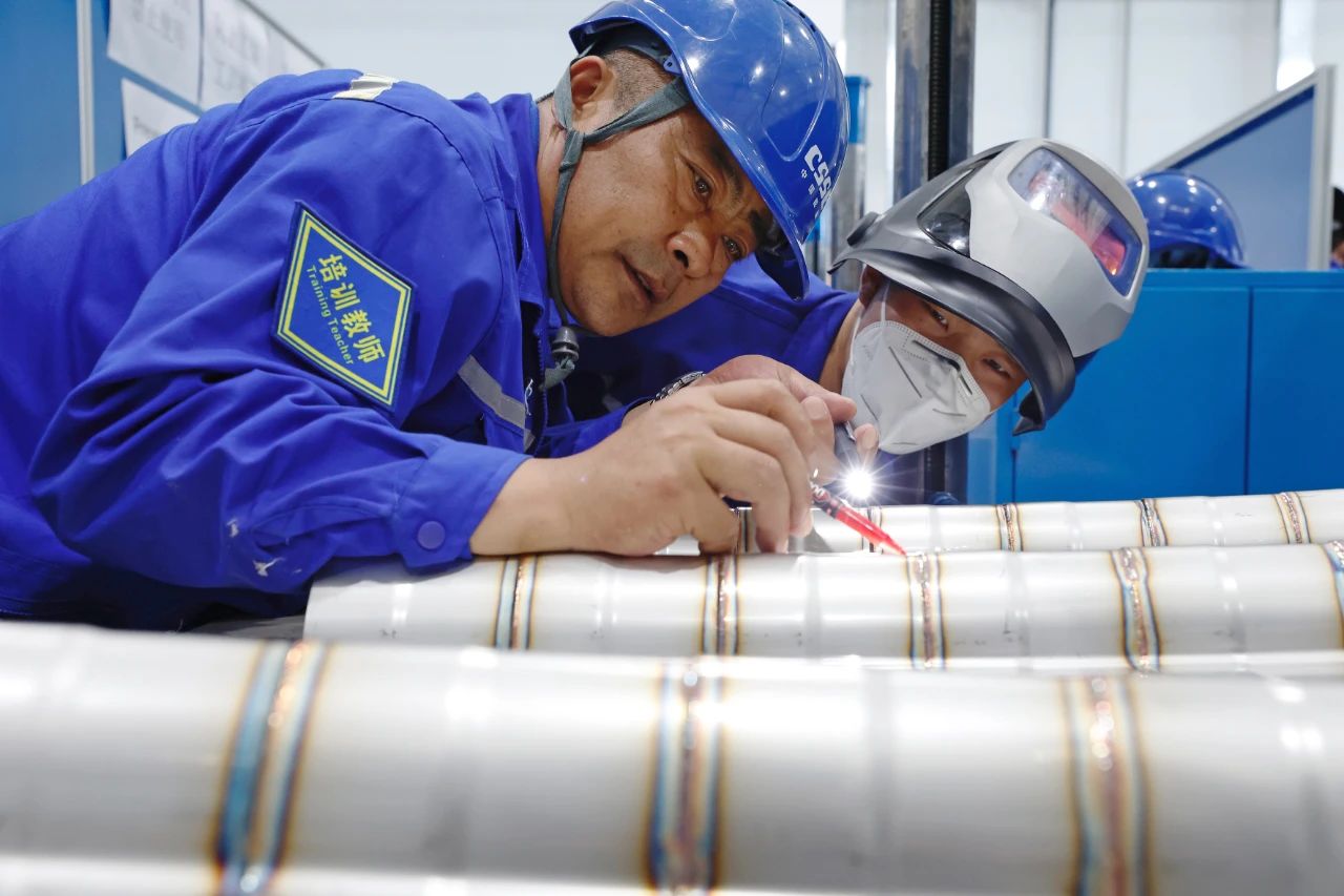 大连造船——LNG综合培训中心,施工人员正在进行货物围护系统粘连作业和焊接作业培训。