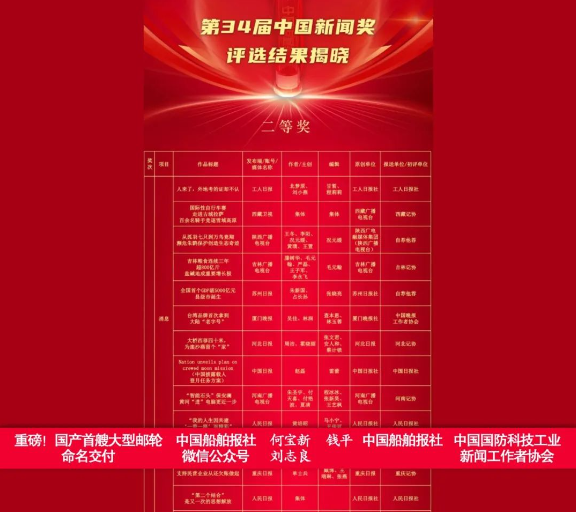 11月7日,中华全国新闻工作者协会主办的第34届中国新闻奖评选结果揭晓。中国国防科技工业新闻工作者协会推荐中国船舶报社特约记者何宝新、记者刘志良主创、钱平编辑的作品《重磅!国产首艘大型邮轮命名交付》获消息类二等奖。