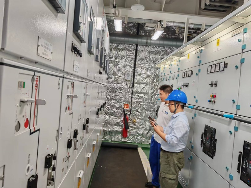 2023年7月,电站试验及系泊试验开始。针对闭环电网保护功能多、保护协调配合要求高、系统调试难度大的难题,项目组开展了闭环电网保护方案设计及调试试验技术研究。闭环电网主保护方案、系统隐藏故障分析及考虑隐藏故障的闭环电网冗余后备保护方案一个个完成设计,闭环电力系统动态仿真数字平台、硬件在环半实物仿真平台、相关故障模拟测试软件一个个开发建立起来。