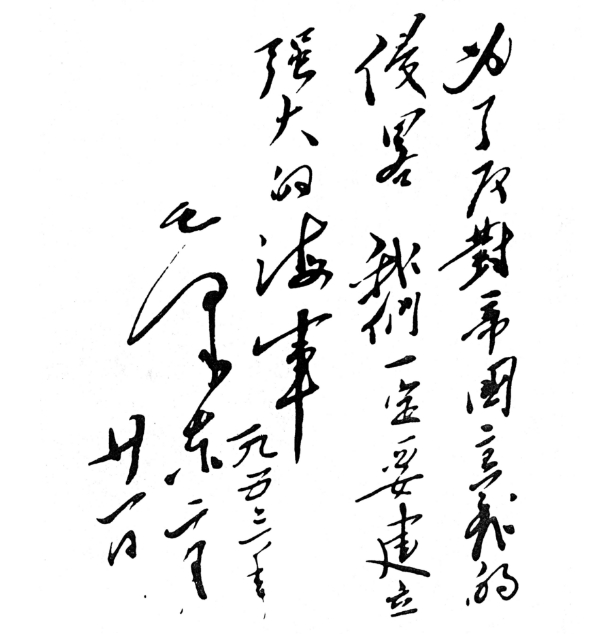 1953年2月19日,毛泽东在武汉登上长江舰视察长江中下游四省,并在长江舰上为海军题词:“为了反对帝国主义的侵略,我们一定要建立强大的海军。”船未行至南京,毛泽东提出要在南京检阅海军战舰。华东海军立即抽调了“广州”号和“南昌”号护卫舰、“黄河”号登陆舰,以及101号、104号鱼雷艇参加检阅。几天中,毛泽东连续5次都写下同样的题词:“为了反对帝国主义的侵略,我们一定要建立强大的海军”。这是中国领导人对建设强大海军、建设一流装备的殷切期望,是新生的中国对建设强大海防的决心。如今这颗刻着伟人嘱托的铭石,静静矗立在江南造船长兴岛造船基地行政楼前的草坪,也静静地矗立在每一位江南人的心中。