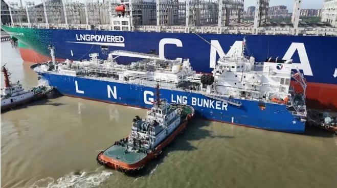 6月20日,全球首款江海直达型LNG加注船“淮河能源启航”号在上海长兴岛顺利完成对全球首艘23000TEU双燃料超大型集装箱船“达飞 雅克·萨德”号的LNG燃料补给作业。这两艘不同领域的“冠军”船舶均由中船集团旗下沪东中华建造,两船首次“牵手”,为航运业绿色低碳发展留下佳话。