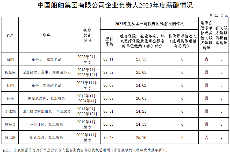 中国船舶集团有限公司企业负责人2023年度薪酬情况