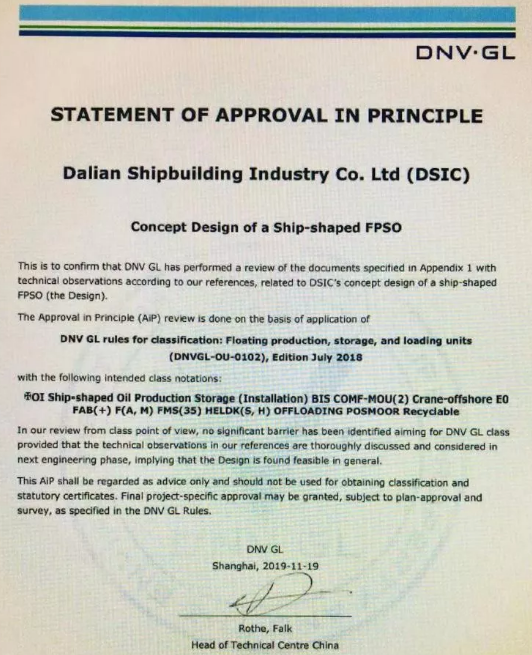 ????11月20日,大船集团在总部举行了“15.5万吨穿梭油船”和“通用型FPSO”设计AIP证书颁发仪式,两型新产品获得DNV·GL原则性认可。