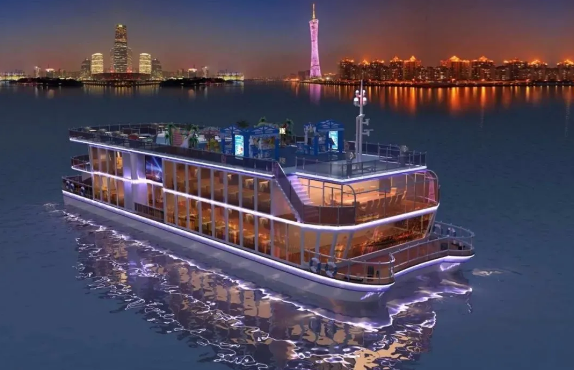 ????280客位珠江夜游船总长38.8米,型宽12.0米,型深3.2米,航速10.0节,是粤港澳大湾区首艘入级商业运营新能源客船,外观设计新颖独特,纯电池动力突显低噪音、低排放、绿色环保的优势,对于推动粤港澳大湾区旅游和交通产业的绿色发展具有重要意义。
