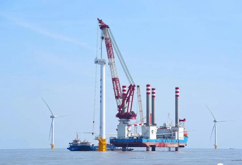 ????本次安装难度大,30号风机单叶片长73.5米,旋转直径达158米,轮毂高度81米。塔筒共分为底、中、顶三段,风机整体总重量790吨以上,相当于500余辆小汽车的重量。“振江号”平台安装3台1800千瓦电力推进全回转舵桨,配备3台750千瓦艏侧推装置。航速7节,续航能力达3000海里,定员100人,平台最大作业水深50米,甲板作业面积约2500平方米,可容纳3套6兆瓦级风机或2套8兆瓦级风机,并且可以独立完成6兆瓦、8兆瓦级风机的安装和其他水上工程施工的起重、打桩、吊装和运输等作业。