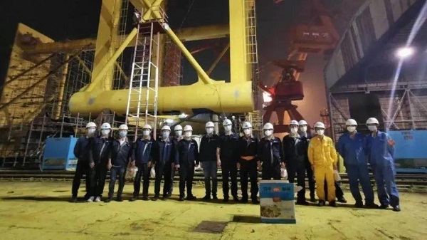 ????同一天,随着最后一块防沉平台箱梁分段顺利吊装,黄埔文冲非船团队已经连续奋战十天十夜。至此,为保利长大公司建造的明阳华西单桩稳桩平台主体工程