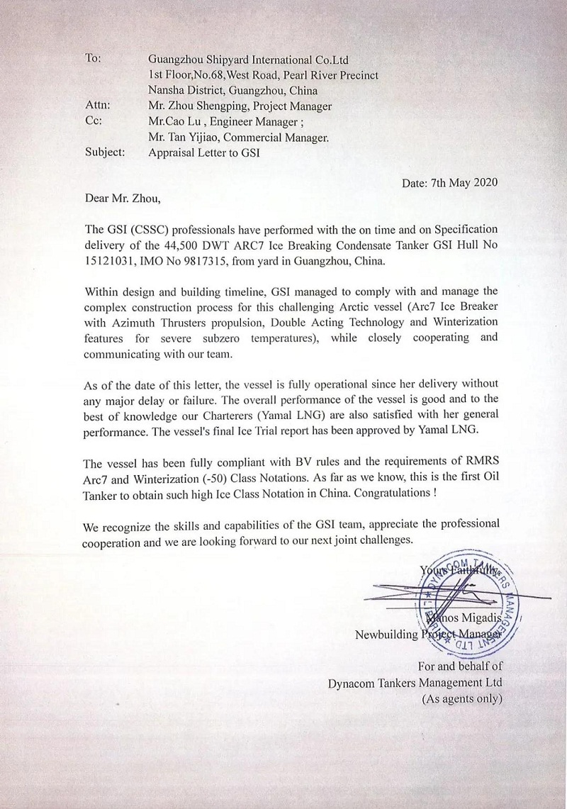 ????5月7日,中国船舶集团旗下广船国际收到了来自希腊Dynacom航运公司的感谢信,信中赞扬了广船国际为其建造的极地凝析油船“BORIS SOKOLOV(鲍里斯索科洛夫)”号