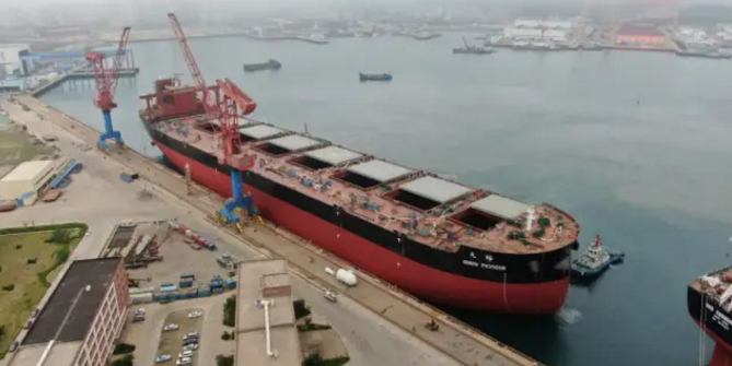 ????6月6日上午,外高桥造船为山东海运建造的18万吨散货船H1494船顺利出坞。