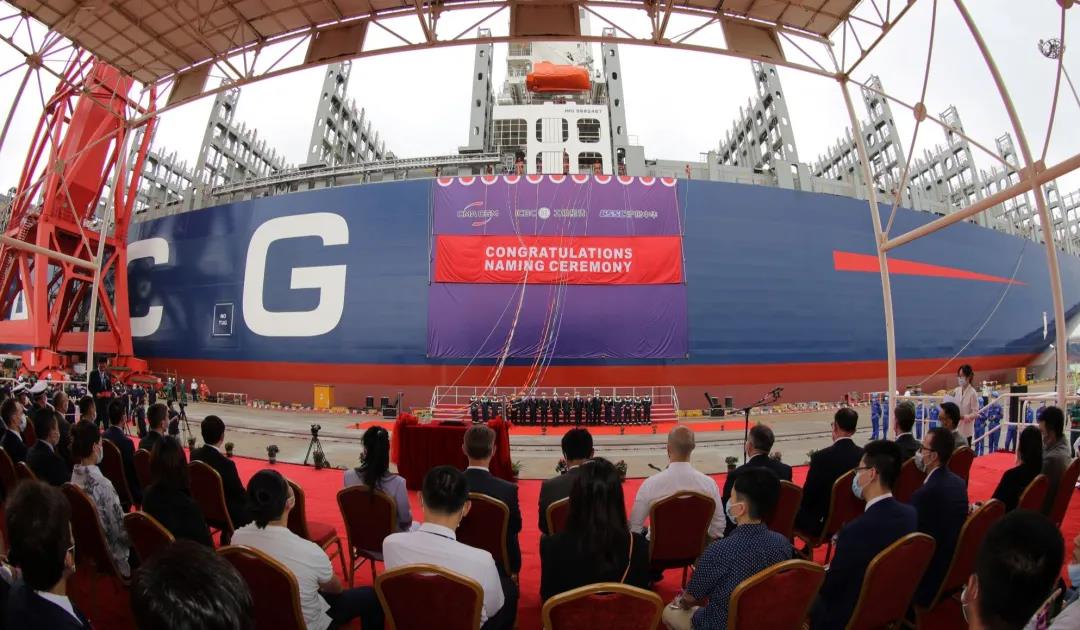 8月27日,由中国船舶集团有限公司旗下沪东中华联合中船贸易为法国达飞海运集团建造的15000TEU超大型集装箱系列船首制船“达飞·和风”号命名交付。这是中法两国船海巨头全面落实2019年中国国家主席习近平和法国总统马克龙见证签署的战略合作框架协议的最新成果。同时,也标志着“CSSC超大型箱船谱系”又添“新丁”,实现了对全球超大型集装箱船发展的引领。