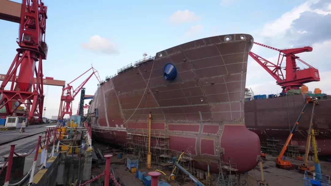 沪东中华与中石油国事签订的LNG项目首制船、17.4万方大型LNG运输船H1831A船顺利完成主甲板贯通,为后续出坞打下了坚实基础。