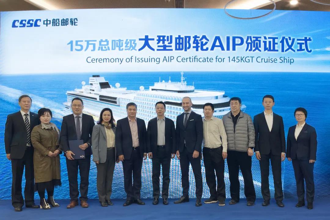 12月9日,中国船舶集团旗下中船邮轮自主研发设计的15万总吨级大型邮轮获得意大利船级社原则性认可(AIP)证书。这是中国首次独立自主研发设计的完全拥有自主知识产权的大型邮轮,一举打破国外在该领域长期技术封锁和垄断,开启中国大型邮轮自主设计新时代。中国船舶集团党组成员、副总经理盛纪纲出席授证仪式并讲话。