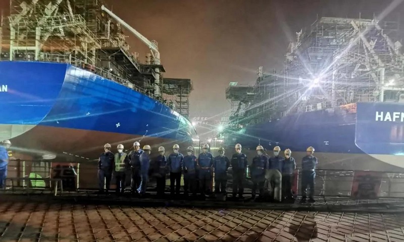????进坞后,两艘船将进行主船体搭载包括主要设备吊装、各系统完整及舱室报验等工作,为吊装、拼接、合拢做准备。