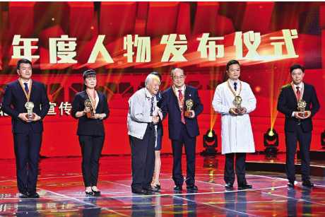 当95岁高龄的黄老出现在舞台上时,张定宇快步向前迎接,这一幕令人动容。黄老在搀扶下,为张定宇戴上奖章,“能为你颁奖,我感到很荣幸。你是祖国的骄傲,人民的英雄!”
