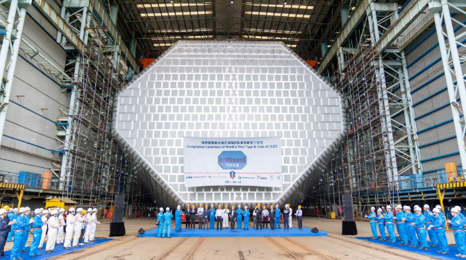 日前,全球最大B型菱形液货舱在江南造船完工,将被用于世界首制99000立方米超大型液化乙烷运输船(VLEC)。江南造船自主研发的B型舱 若配置不同的舱体材料和绝缘系统  ,可适用于装载不同温度的液化气货品。