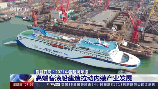 这里是中国船舶广船国际的造船码头,多艘大型豪华客滚船正在紧张调试和建造。负责人告诉记者,2021年,像这样的高端客滚船他们厂一共建造完工了5艘,产值占比达到约40%。
