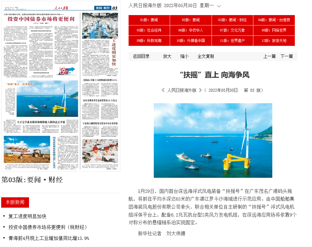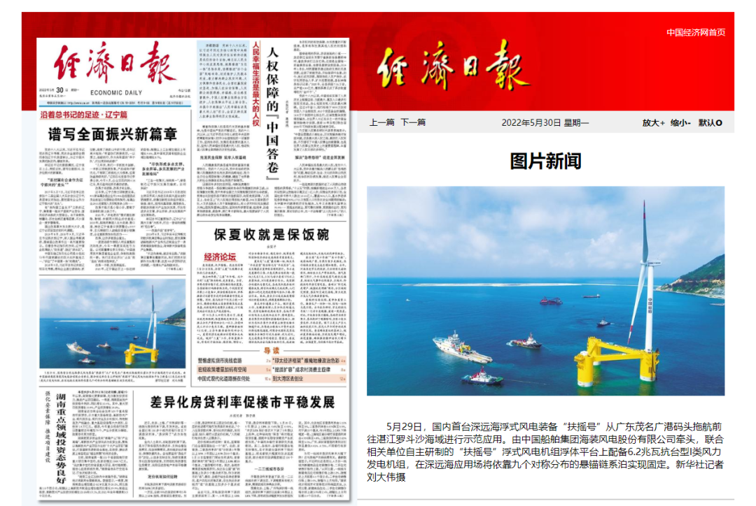 5月29日,中国船舶集团旗下中国海装牵头研制的国内首台深远海浮式风电装备——“扶摇号”从广东茂名码头起航,前往平均水深65米的广东湛江附近海域投入示范应用。