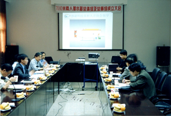 △7000米载人潜水器总体组及总师组成立大会,发言者为徐芑南。