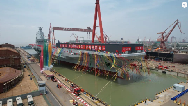 2022年6月17日,我国第三艘航空母舰下水命名仪式在中国船舶集团有限公司江南造船厂举行。经中央军委批准,我国第三艘航空母舰命名为“中国人民解放军海军福建舰”,舷号为“18”。福建舰是我国完全自主设计建造的首艘弹射型航空母舰,采用平直通长飞行甲板,配置电磁弹射和阻拦装置,满载排水量8万余吨。该舰下水后,将按计划开展系泊试验和航行试验。福建舰顺利下水标志着我国海军装备现代化建设取得了又一重大的历史性突破,对于进一步提升我国海军维护国家海洋权益的能力具有重要意义。