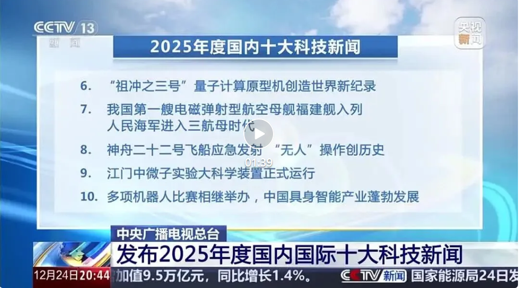 12月24日,中央广播电视总台发布2025年度国内十大科技新闻,我国第一艘电磁弹射型航空母舰福建舰入列人民海军进入三航母时代位列其中。