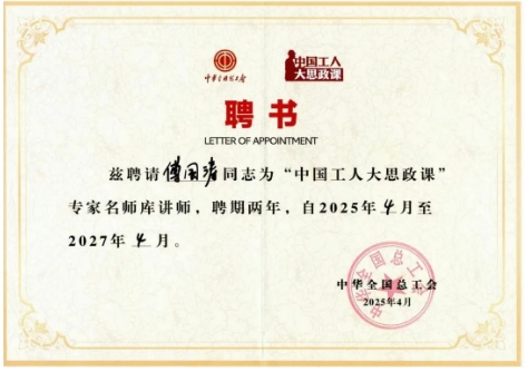 近日,中华全国总工会正式聘请中船集团重庆红江傅国涛为“中国工人大思政课”专家名师库讲师,聘期两年。这一聘任旨在推动“大思政课”建设走深走实,发挥优秀人才在思想政治教育中的示范引领作用。
