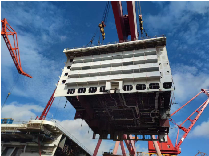 此次完成搭载的U2总段以乘客住舱区域为主,跨度为五层甲板,是邮轮搭载的首个带阳台的总段,其顺利搭载是总段完整性建造速度提升和船坞快速搭载的集中体现。